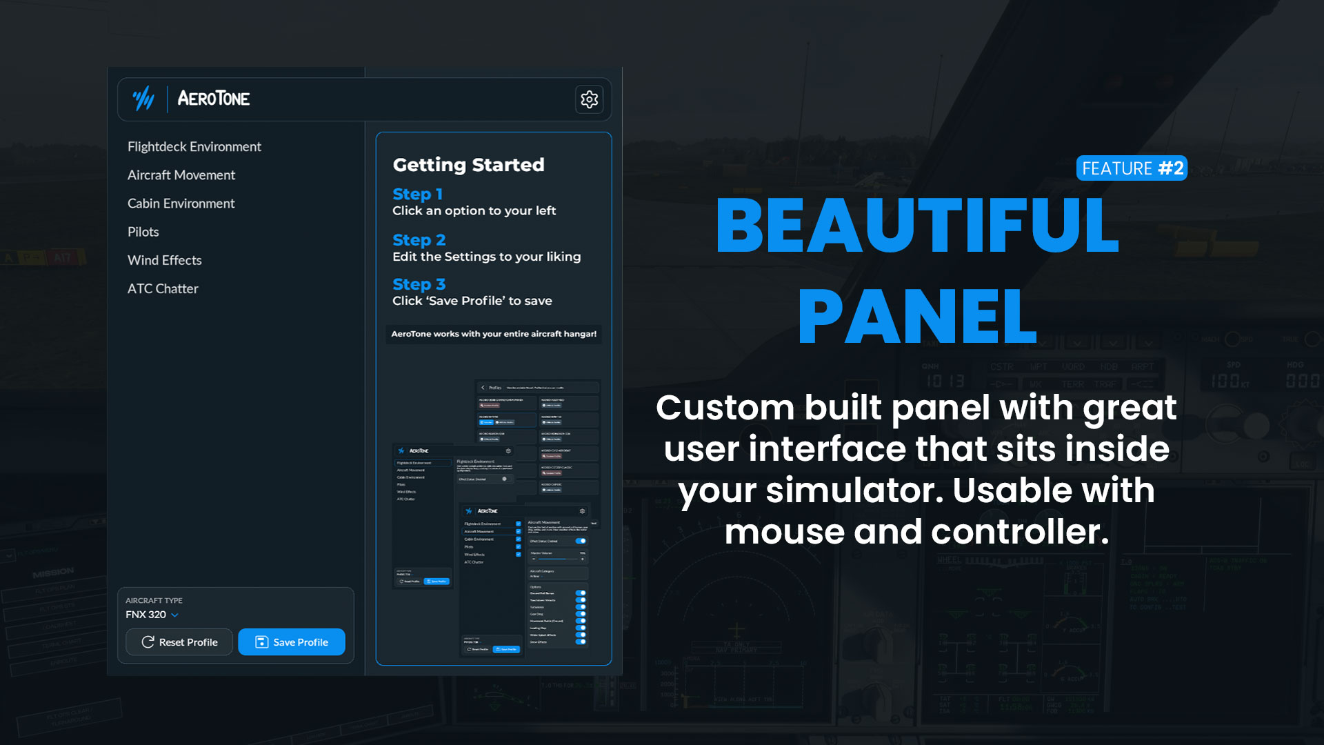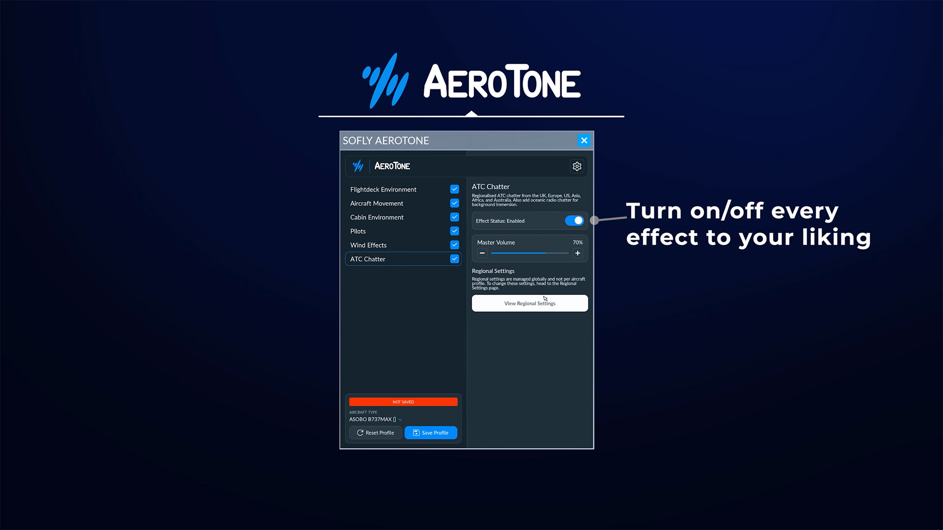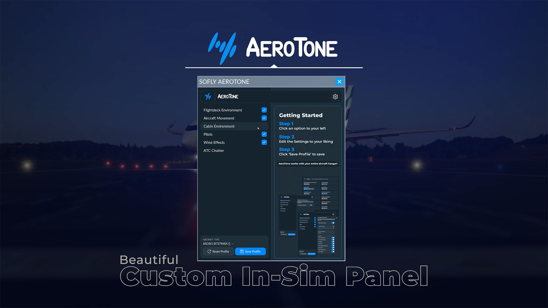 AeroTone is fully customisable. The custom in-sim control panel allows you to adjust volume levels, toggle individual sound elements, or completely disable entire sound categories with a single click. Official presets ensure accurate audio out of the box for many aircraft, while custom profile support allows you to tailor the sound of any aircraft to your preferences. If you create something you love, you can share it online, or download profiles created by other simmers.