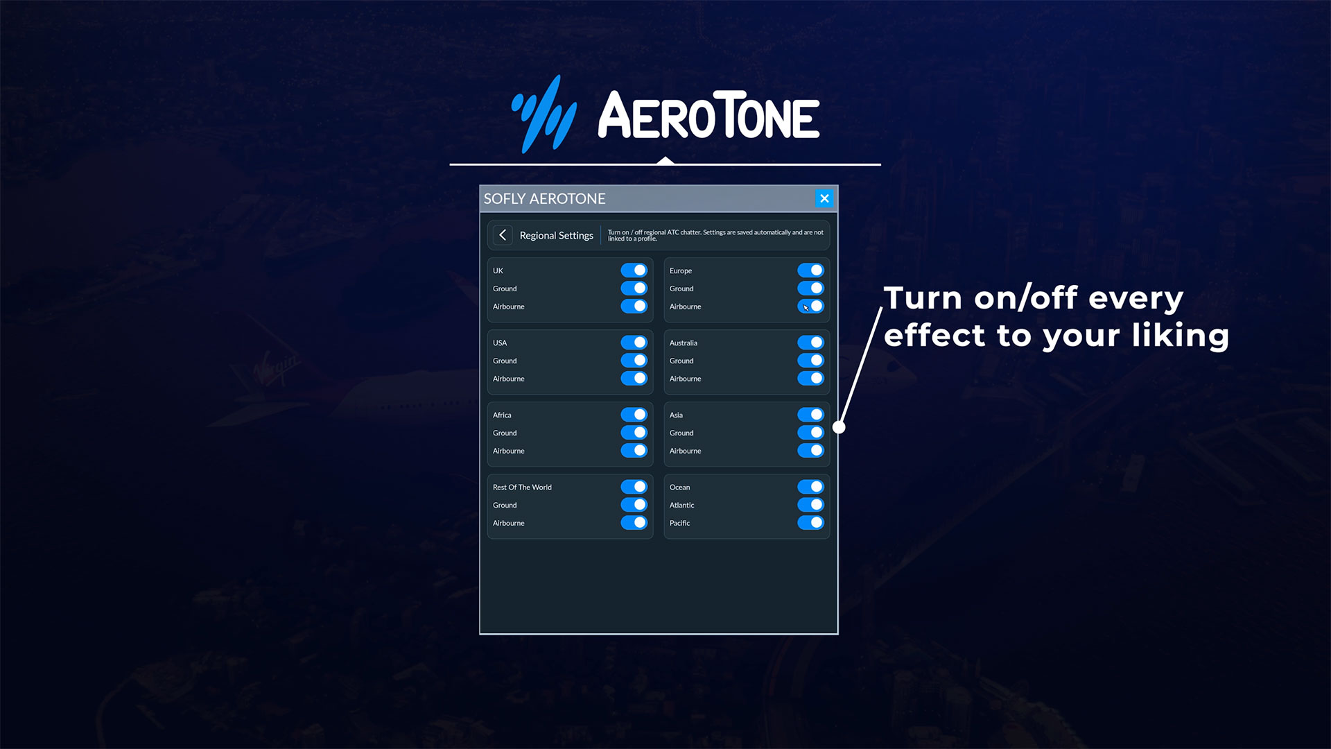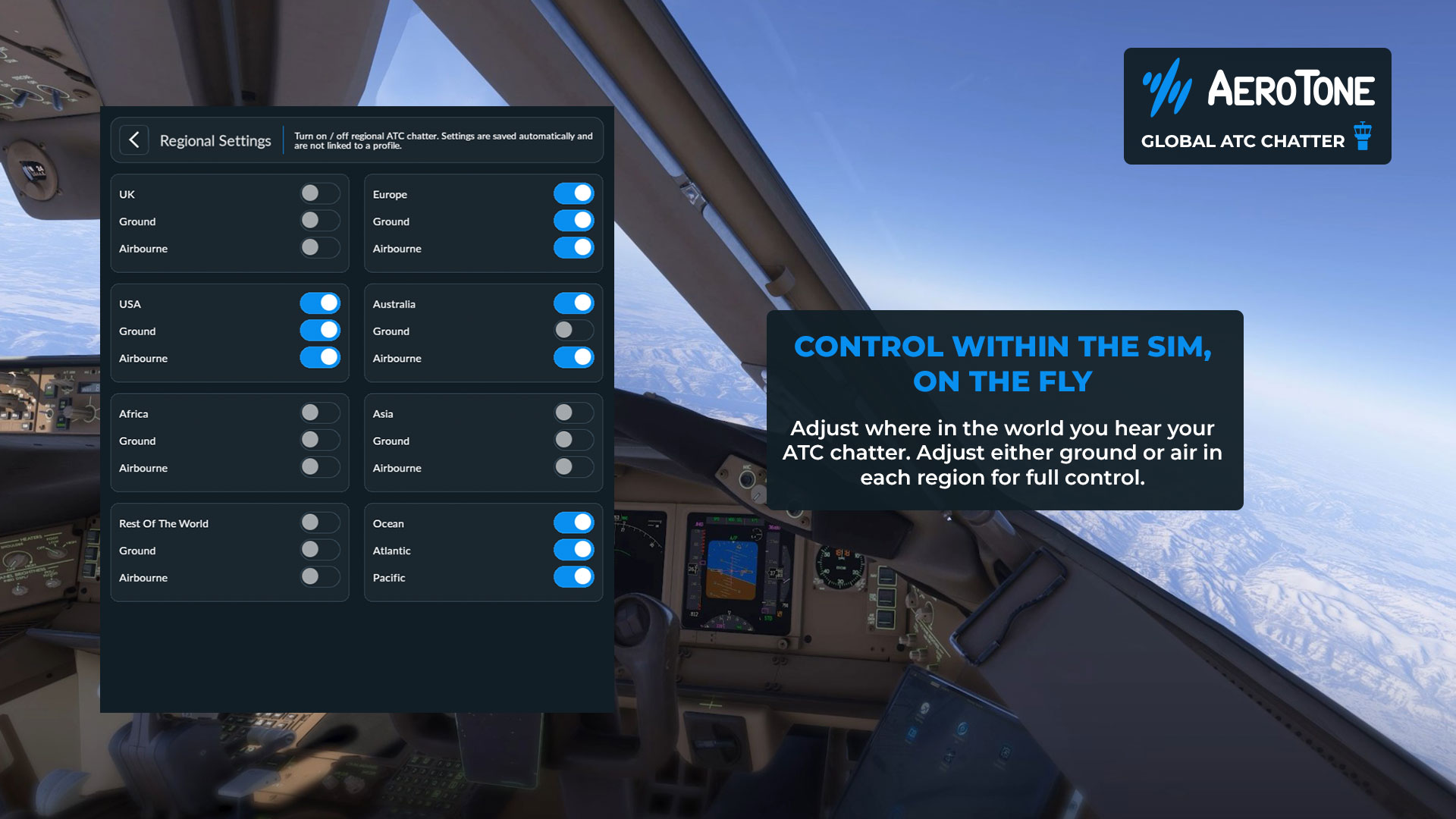 You’ll also never feel alone in the sky. AeroTone includes over 100 hours of pre-recorded ATC chatter that adapts to your current location. Regional audio spans the UK, US, Europe, Asia, and more. Included is also oceanic radio ATC provides long-haul immersion across transatlantic and transpacific flights.