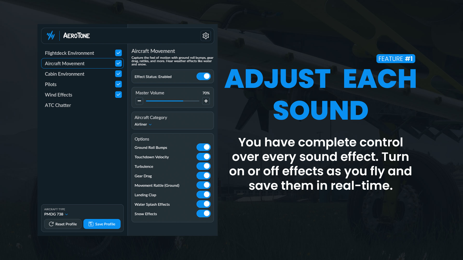 Adjust sound levels, presets, and balance while you fly – no third-party tools necessary. - Authentic Sound Design by Echo19