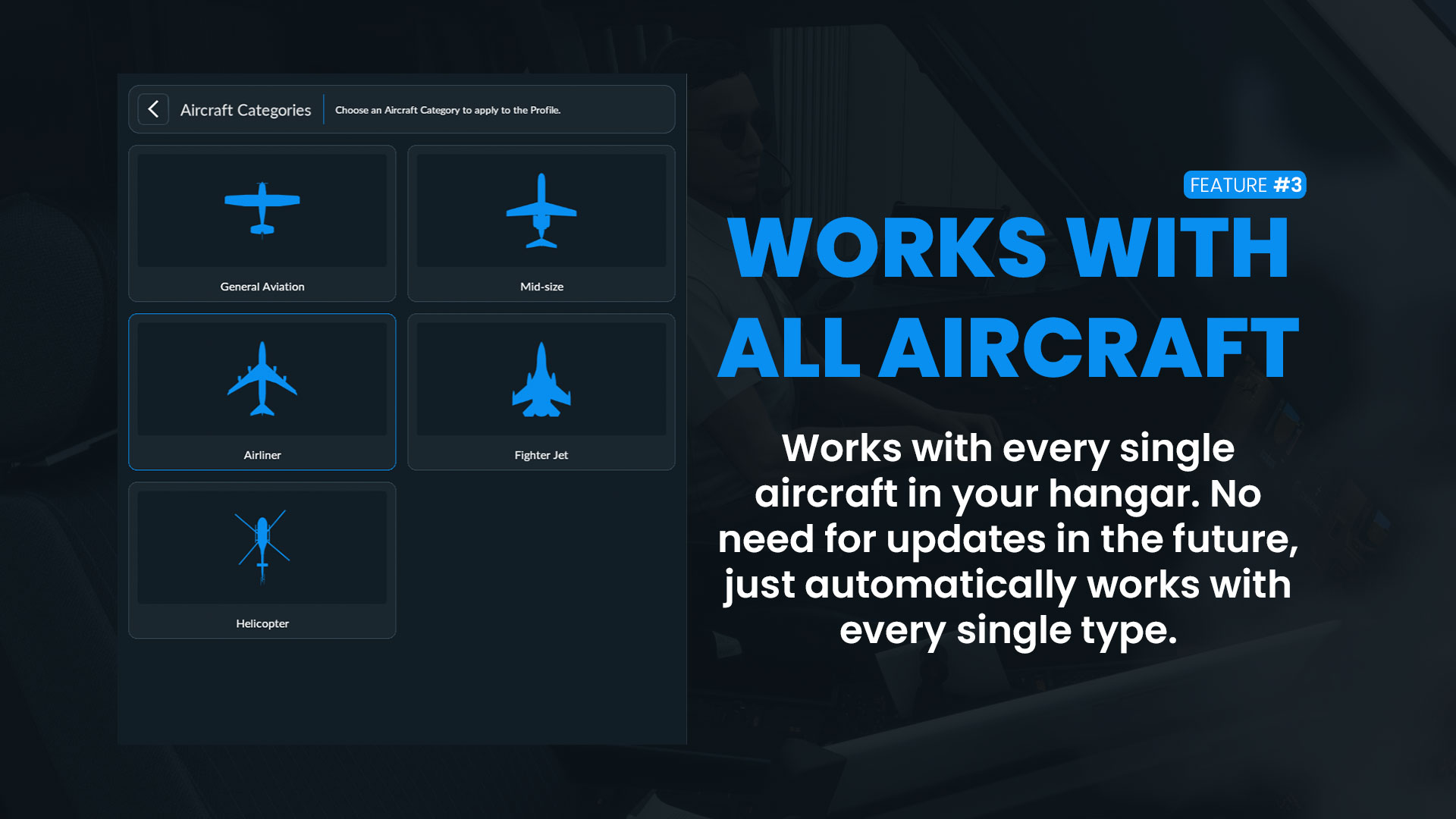 Works seamlessly with built-in aircraft, helicopters, jets, gliders, and supported third-party add-ons. - Over 120 Official Profiles Included