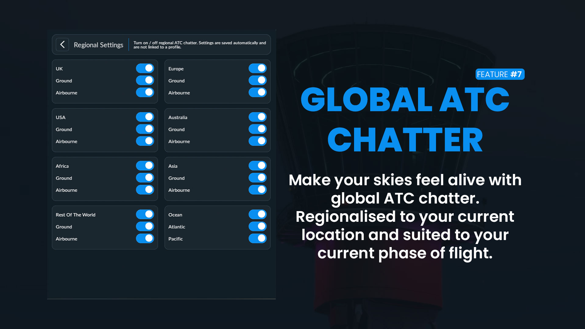 Over 100 hours of recorded ATC chatter that adapts based on location and whether you are taxiing or airborne. - Compatible With All Aircraft