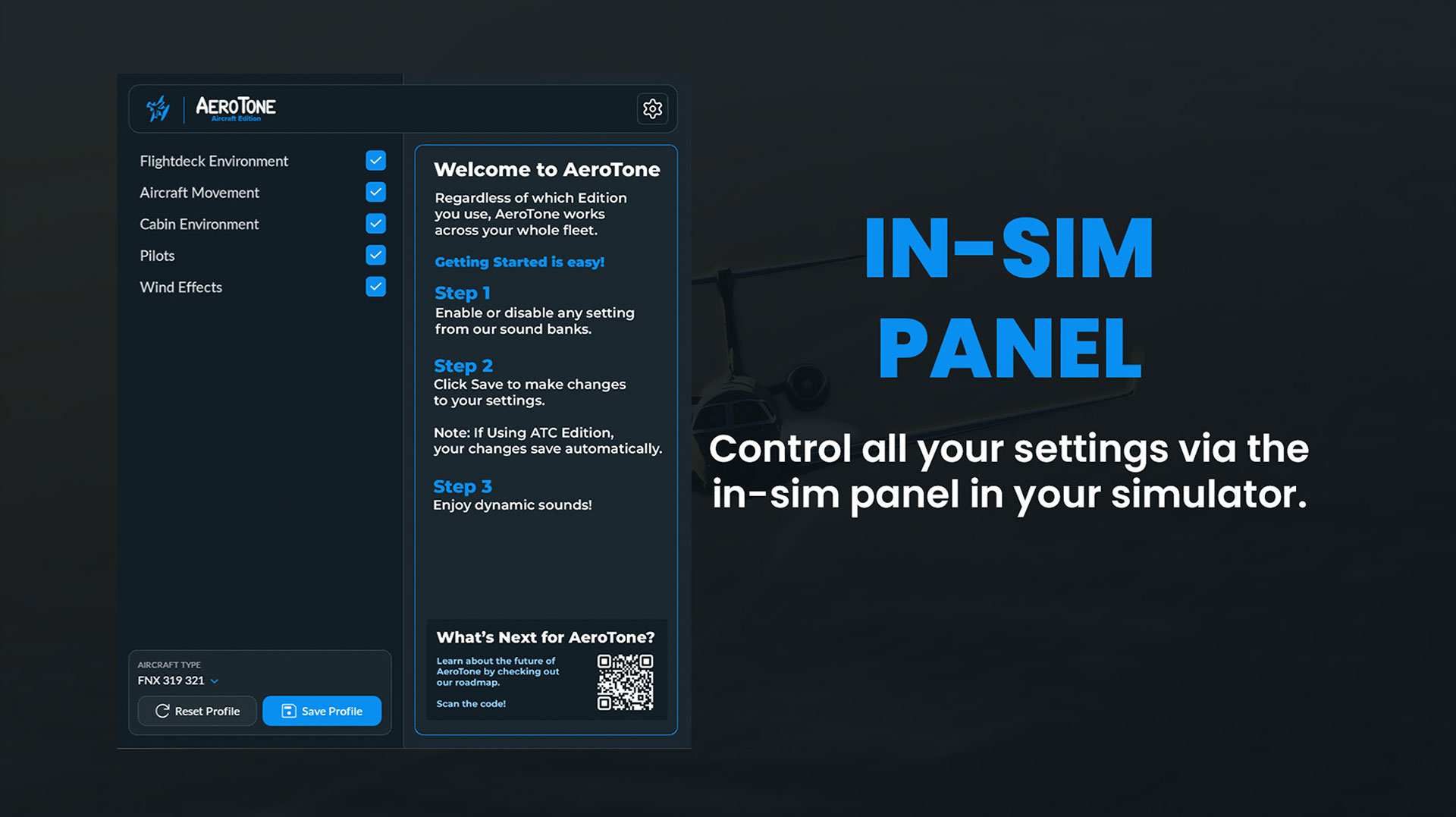 AeroTone: Aircraft Edition is fully customisable through a dedicated in-sim control panel. Adjust volume levels, toggle individual sound elements, or disable entire sound categories with a single click. Official presets provide accurate audio out of the box for many aircraft, while custom profiles let you tailor the sound of any aircraft to your personal preferences. Profiles can also be shared with other simmers for easy community collaboration.