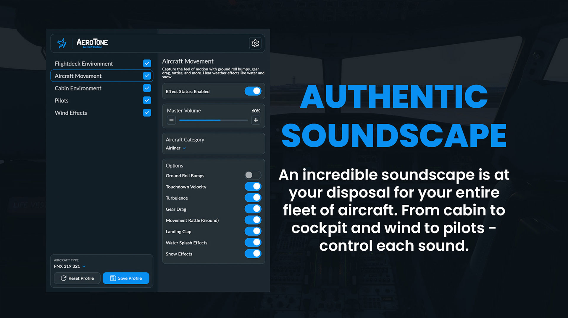 Experience authentic aircraft sound design built from hundreds of professionally produced recordings covering a wide range of aircraft types and flight conditions. AeroTone adds depth and detail to engines, wind layers, avionics, airframe movement, and environmental effects, creating a multi-layered acoustic experience throughout every phase of flight.