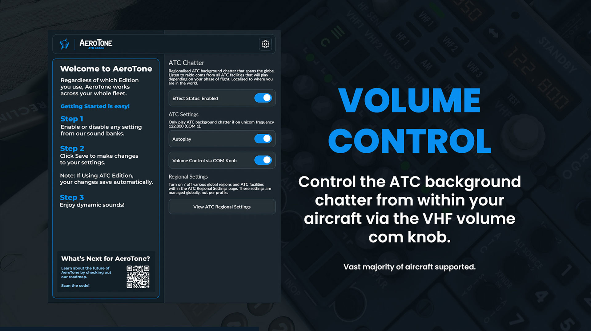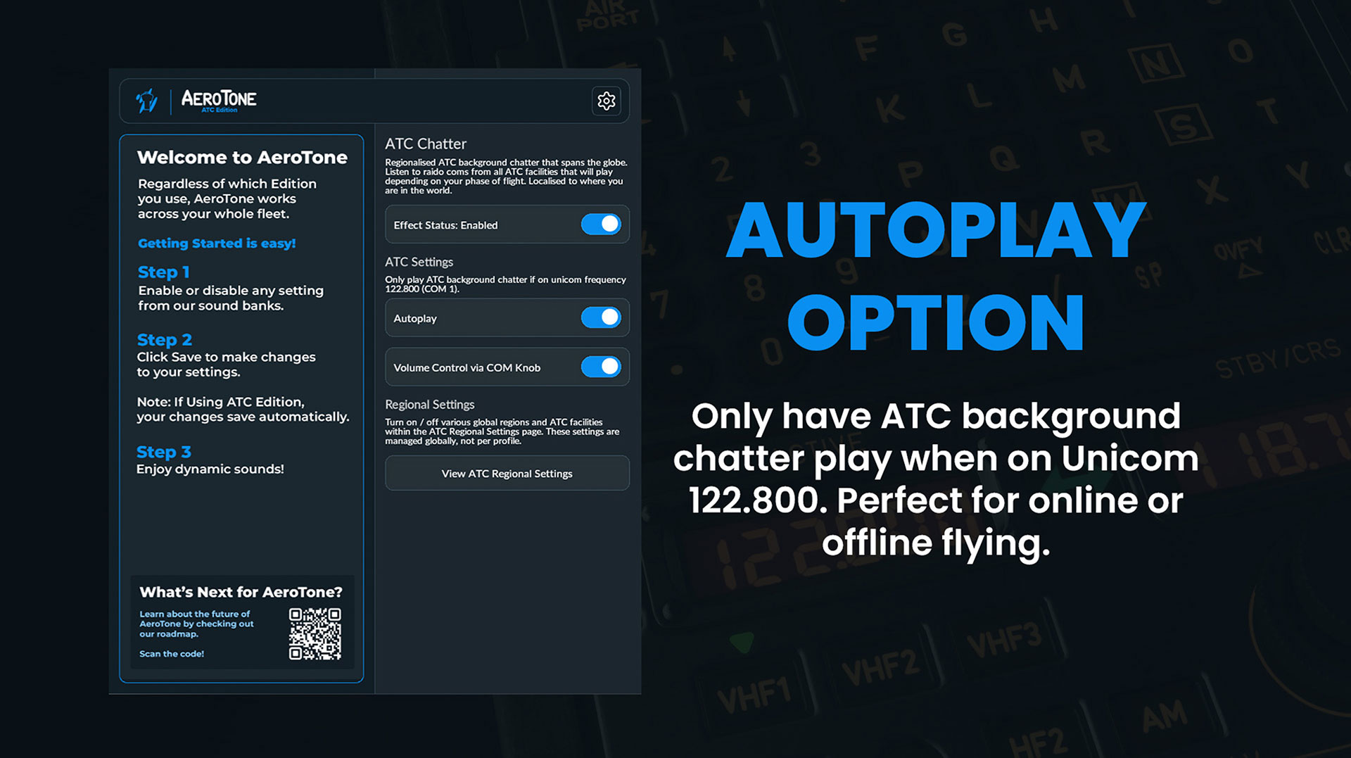 AeroTone now supports automatic ATC playback when tuned to 122.800. Chatter plays only while you’re on the UNICOM frequency, and stops instantly when you switch frequencies, allowing you to communicate normally with live or offline ATC. You can also control the chatter volume directly using your VHF radio knob, giving you seamless in-cockpit integration with your favourite aircraft.