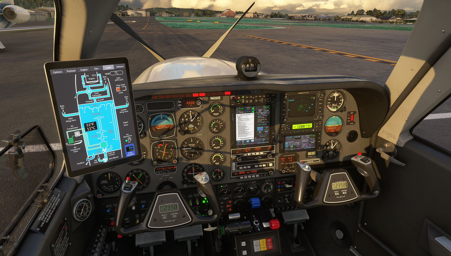 Black Square’s Bonanza Professional brings you one of the most technically advanced aircraft simulations for Microsoft Flight Simulator, with an advanced reciprocating engine simulation, 110+ possible failures, 12 hot-swappable radio configurations, and the most advanced turbocharger and cabin temperature simulations in MSFS. The new tablet interface lets you configure all options, manage payload, control failures, and monitor engines, electrical schematics and environmental control systems, all from within the simulator.