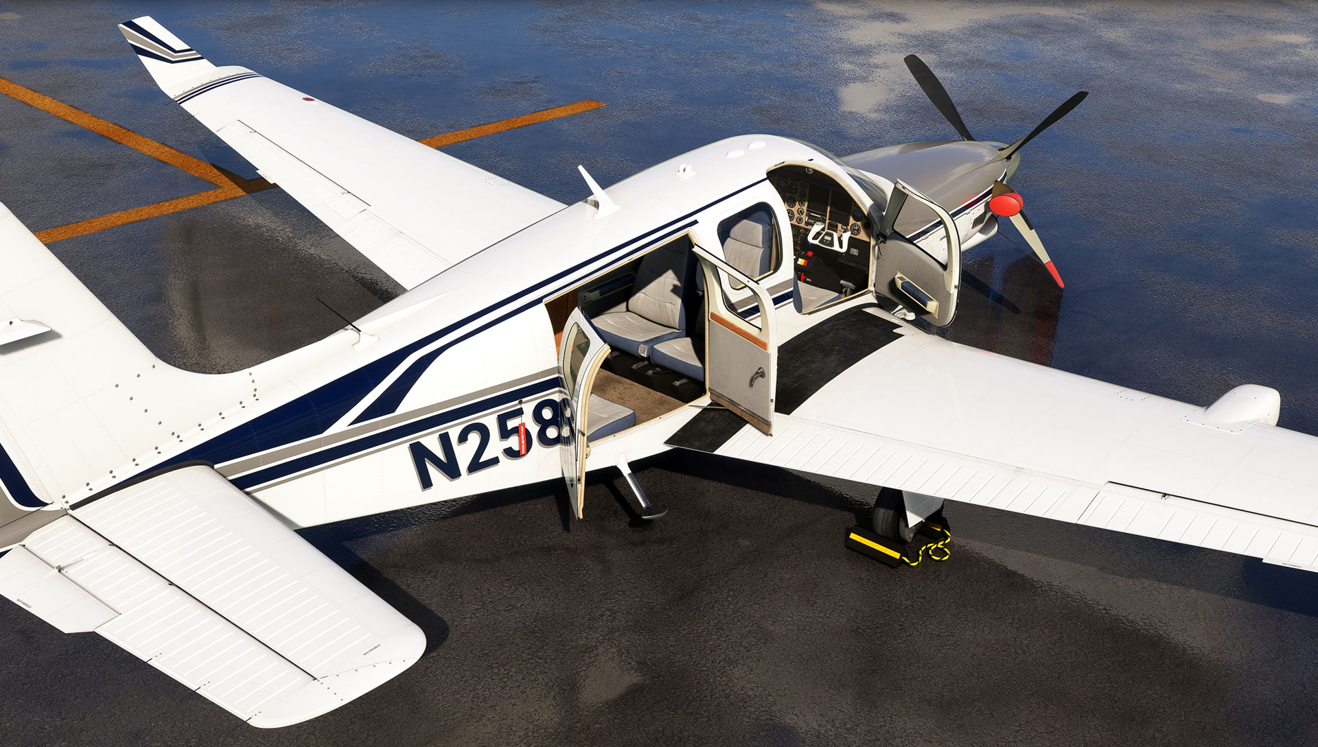 The Black Square Bonanza Professional comes with six paint schemes for the reciprocating engine aircraft, and an additional three for the Turbine Bonanza. The Bonanza Professional also comes with six interior upholstery packages that represent the aircraft through decades of service. This product makes use of Black Square’s highly customisable dynamic tail number system, which can be configured by livery makers. See the 'Custom Dynamic Tail Numbers' section of the manual for more information.