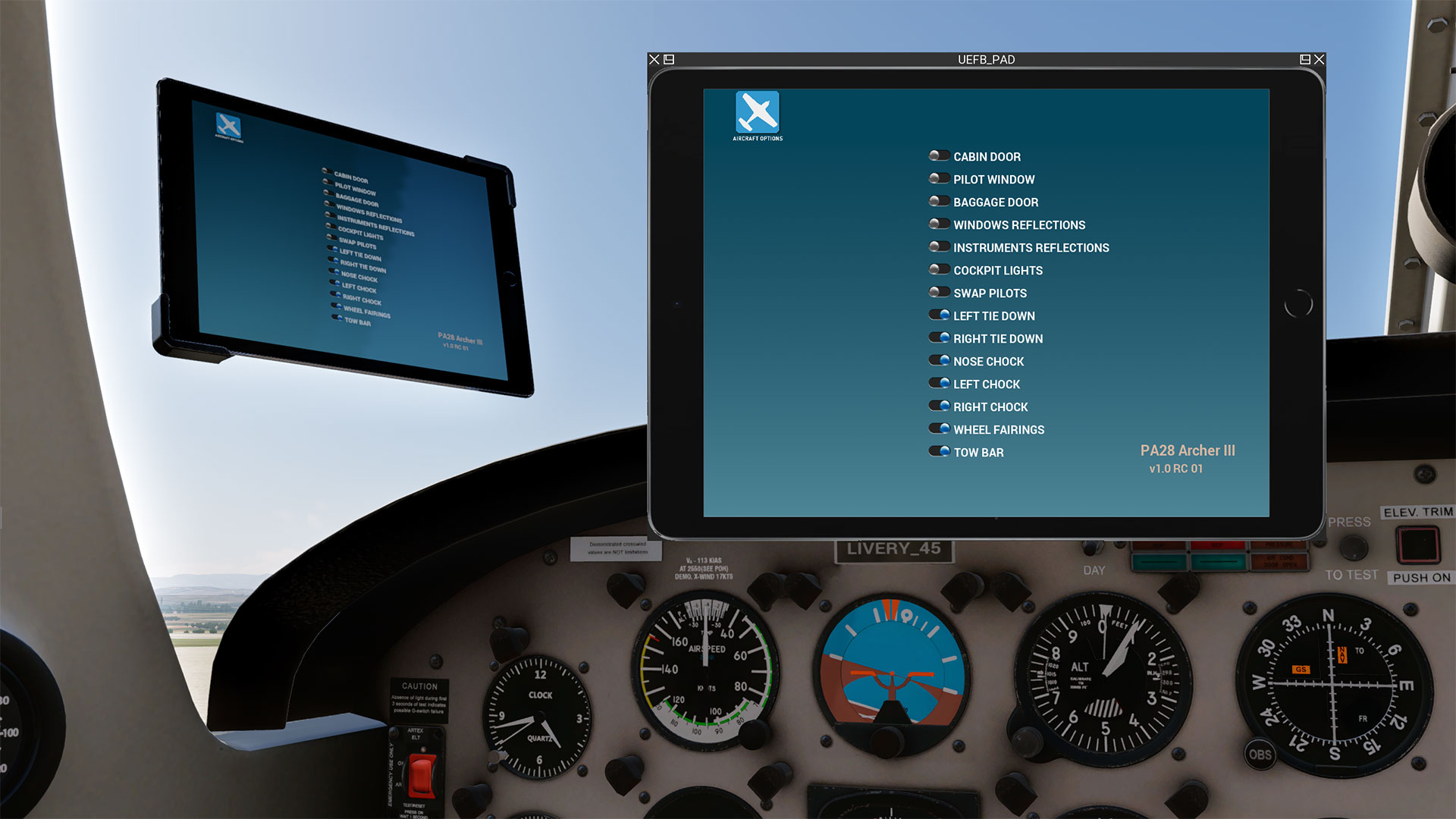- The Archer III also comes with Thranda’s Dynamic Livery System which allows you to create your own liveries from within the intuitive EFB app. These are available in four different styles with all colours, registrations, level of dirt and reflectiveness being adjustable, allowing for some fun and truly unique creations.