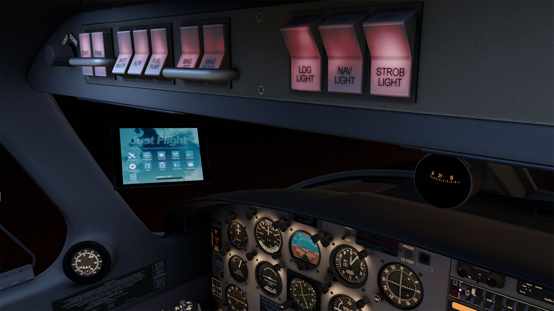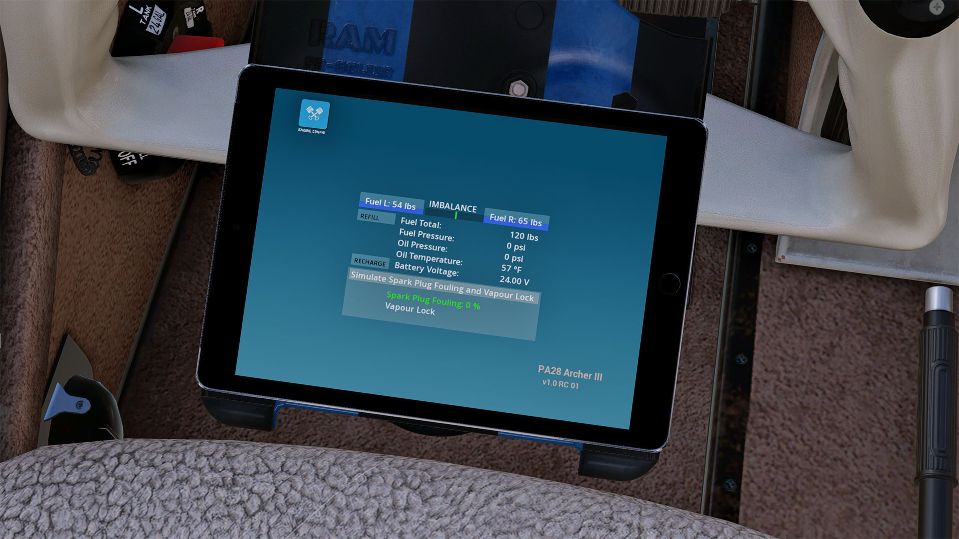 - Dedicated interactive engine EFB app displaying values such as fuel tank weights and imbalance, fuel pressure, oil pressure, oil temperature, battery charge (with quick charge option), and information about spark plug fouling and vapour lock condition