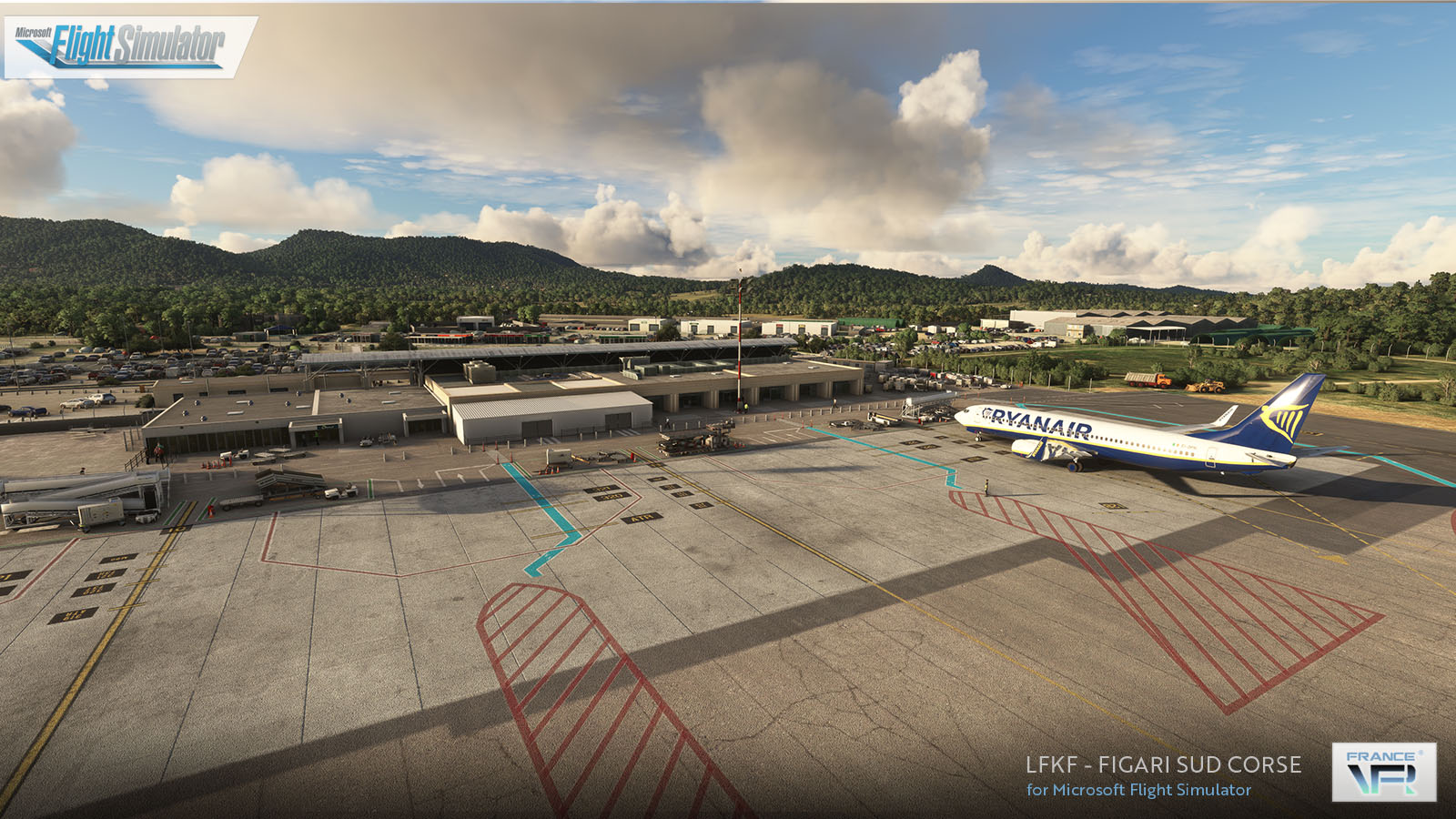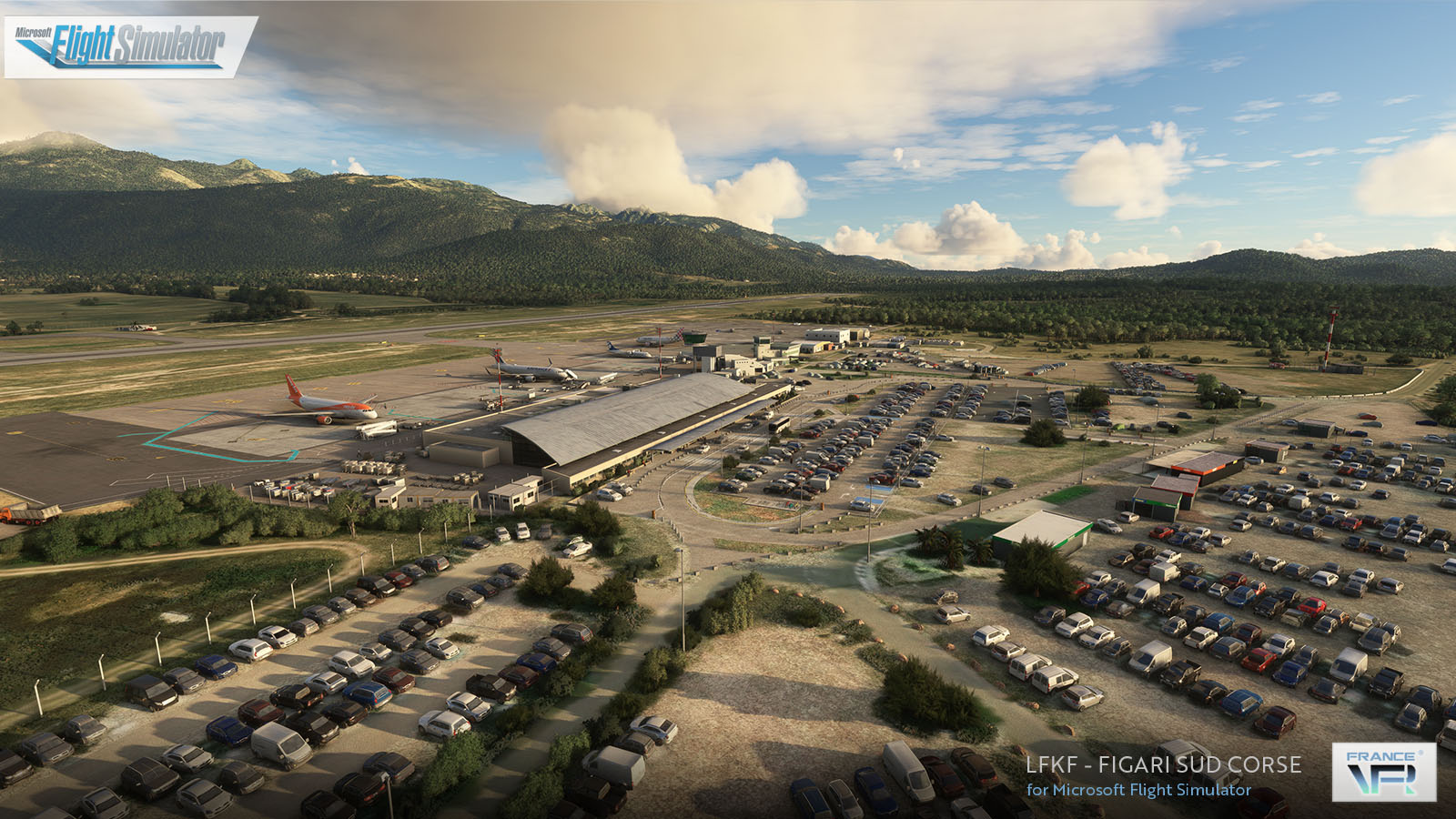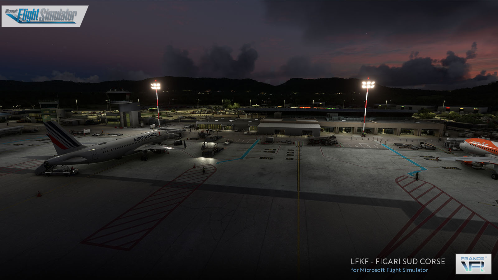 LFKF is an airport add-on for Microsoft Flight Simulator from the Airport France Pack 5 which models Figari Sud Corse airport in extremely detailed fashion, including airport buildings, textures and ground markings as well as its night lights and many objects on the platform.