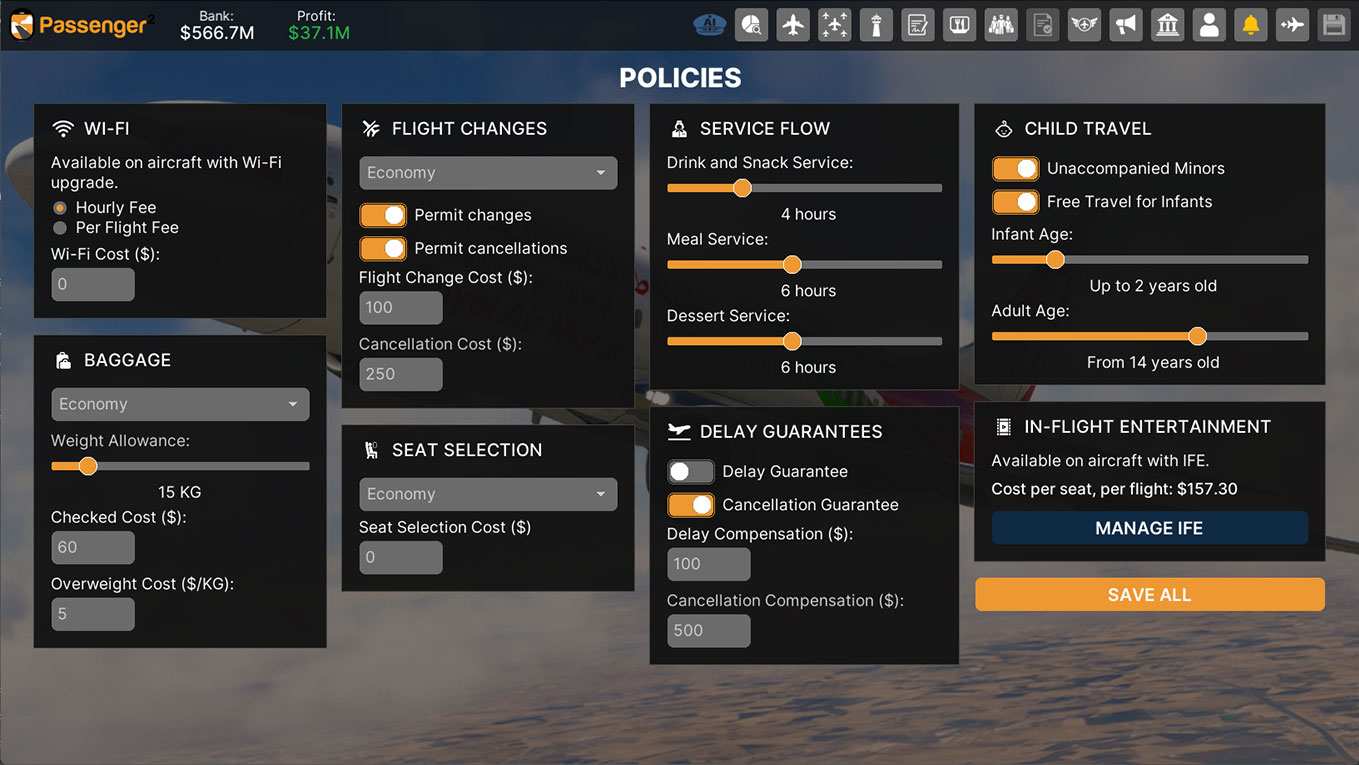 Every decision matters. Choose the meals you serve, the movies you show, and the loyalty rewards you offer. Set your baggage rules, define your seat pricing, and decide how generous – or strict – your policies will be. Your passengers will notice, and they’ll remember.